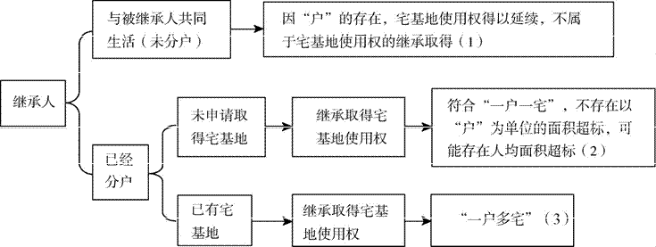 以具有本集体经济组织成员身份的继承人为研究对象(见图2),继承人有“未分户”和“已分户”两种情形。第(1)种情形,未分户(即与被继承人共同生活)的继承人,以“户”为单位继续享有宅基地使用权,不属于宅基地使用权的继承取得。第(2)种情形,已分户但未申请宅基地的继承人,继承取得宅基地使用权且“一户一宅”,以“户”为单位的宅基地面积无变化,不存在以“户”为单位的面积超标。在以人口为单位规定宅基地面积标准的地区,可能出现人均面积超标。但此种情形发生的概率较小,一方面,以人口为单位划定人均宅基地面积标准的地区偏少;另一方面,宅基地面积不变而人均面积超标,需继承后享有宅基地使用权的人数相比继承前有所减少,如推定父母同时死亡,由唯一的儿子继承,这种情形具有一定的偶然性。此外,由于房屋具有整体不可分性,即使继承取得宅基地使用权出现人均面积超标的情形,也不能强行拆除部分房屋而将超标的宅基地收回,对此可根据《国土资源部关于进一步加快宅基地和集体建设用地确权登记发证有关问题的通知》(2016)的有关规定进行处理。该《通知》在实践中的运用,对继承前就已存在的宅基地面积超标问题也提供了解决路径。已经分户且已有宅基地的继承人,继承取得宅基地使用权将形成一户多宅的情形(情形(3) ),可将其归入到“一户一宅”原则中去讨论其合理性与否的问题。