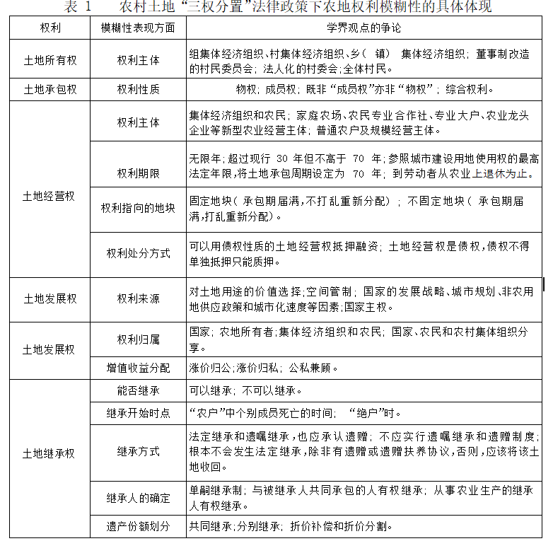 目前,诸多学者针对农地产权模糊性的具体表现展开了较为充分的研究,陈忠卫、王文举认为,农地产权模糊性表现在所有权模糊化和使用权模糊化两个方面;黄砺、谭荣认为,模糊的农地产权应指农地控制权实际归属上的模糊;王桢桢认为,农地产权模糊体现在三个方面:产权主体模糊、产权内涵模糊和产权处分模糊。在当下农村土地“三权分置”的法律政策下,学术界普遍认为农地产权结构应分解为所有权、承包权、经营权,“集体所有、家庭承包、多元经营”是农地制度创新的基本方向。因此,即使农地产权存在模糊性亦应仅限于所有权、承包权和经营权这三项权利上,然而,本文认为,农村土地“三权分置”法律政策下所形成的农地产权格局是以土地用途管制、农地农用为前提的,在农地非农转用时,还涉及到农地发展权问题,即农地由农业用途向最高最佳的非农建设用地用途转换的权利。在承包人死亡时,还涉及到农地权利继承权问题,即农地权利作为被继承人的一项财产由继承人继承。因此,在诸多学者研究的基础上,基于农地农用和农地非农化转用、承包人生前和承包人逝世后两个维度,本文认为,完整的农地权利结构应包含五项权利,即所有权、承包权、经营权、发展权、继承权,故而,农地产权模糊性在这五项权利上均有体现(详见表1)。