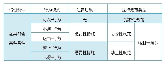 人们通常认为,法律规范是由三个部分构成的,即“假设条件+行为模式+法律后果”。其中的“行为模式”通常是由“规范模态词+行为”构成的,“规范模态词”则主要包括“可以”、“应当”、“必须”、 “禁止”、“不得”等类型。依照不同的规范模态词类型,我们可以将法律规范分为“授权性规范”、“命令性规范”和“禁止性规范”三种类型(见下图):