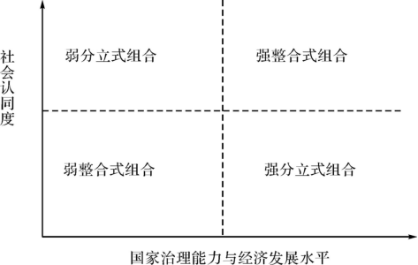 通过以上的分析可以看出,国家治理能力与经济发展水平和村民对治理单元的社会认同度共同作用影响了农村基层治理单元的组合模式(如图1所示)。当国家治理能力与经济发展水平和村民社会认同度都比较高时,农村自治单元和服务单元就可能出现强整合的组合模式,如浙江杭州的治理组合;当两者同时都比较低时,农村自治单元和服务单元就可能出现弱整合的组合模式,如传统时期乡村政府无为而乡村自治的治理模式;当社会认同度较高,而经济发展相对落后时,则可能出现清远这种自治下移、服务上移的单元弱分立模式;当经济发展步伐较快,而社会认同被打破时,自治单元与服务单元则可能出现强分立式组合,以其中一方的职能被侵蚀为代价,如人民公社时期的乡村治理单元,生产服务功能性强,而村民自治能力则被忽略。