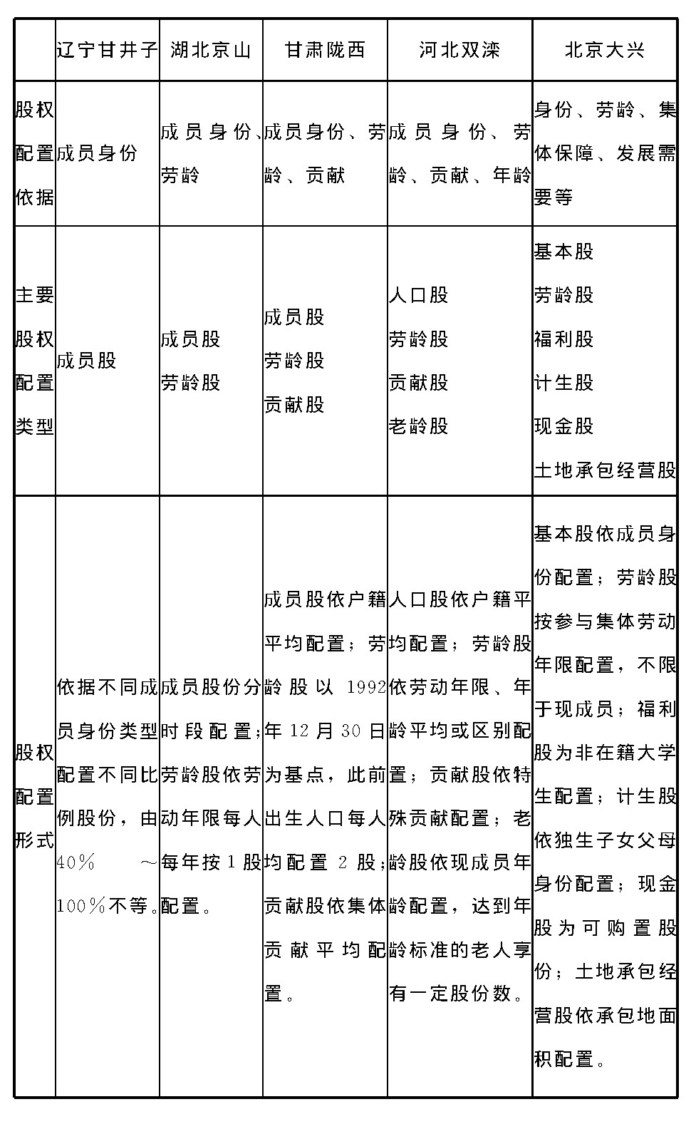 二是按贡献进行股权配置。这里的贡献主要是指为集体经济积累与发展所做出的贡献。从各地改革实践来看,该类贡献主要可分为两类:一类是劳动贡献,另一类是其他特殊贡献。劳动贡献是最为普遍的,主要是指农民个人作为集体成员参加集体劳动而为集体经济的积累与发展所做出的贡献,其主要衡量依据是农民的劳动时间。因此,在改革实践中又将以劳动贡献为基础而设置的股权称为农龄股、劳龄股等。如湖北京山城畈村为体现不同历史阶段成员为集体发展所做的贡献便设置了农龄股,并按照成员登记的劳动年限进行配置,每人每年按1股计算,满股为18股;甘肃陇西东巷村则以1992年12月30日为节点,规定在此时间之前出生的成员均按照每人2股配置农龄股。尽管各地配置比例、方式有所不同,但均能在一定程度上体现对成员劳动贡献的尊重。其他特殊贡献主要是指部分成员为集体经济发展所做出了其他突出贡献,其内容较为广泛,如甘肃陇西东巷村因早期提留了部分村民小组征地费用用于集体经济建设,为体现不同村民小组为集体经济所做的贡献便设置了贡献股,配置给有提留的村民小组成员。与按成员身份配股有严格的范围限定不同,从各地改革实践来看,按贡献配股并未仅限于集体经济组织内成员,部分非集体经济组织原成员也在配置范围内,如北京大兴。