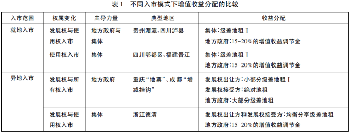 (一)通过对不同入市模式增值收益分配的比较,指出就地“使用权”直接入市模式和异地“发展权与使用权”入市模式均以集体为主导入市,均保持了集体土地所有制的性质不变,且通过市场价格机制显化了土地的财产功能,入市后集体获得了大部分级差地租。因此,这两种模式是未来农村集体建设用地入市的改革方向。