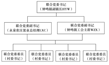 “中共永泉村企发展联合委员会”于2018年5月18日正式挂牌。其成立具有鲜明的现实导向性,即回应村企发展需要,解决村企合作缺乏协调平台的问题。当地干部称:“开展村企联建,群众有需求、企业有意愿,把群众需求回应好,把企业意愿引导好,农村党建大有可为。”从组织架构看,村企联合党委由钟鸣镇党委牵头成立,钟鸣镇副镇长HYW任联合党委书记,永泉农庄置业总经理LXC、钟鸣镇工会主席WZX任副书记,所联合的4个村的党支部书记任联合党委委员(图1)。联合党委设永泉农庄党支部、金桥村党委、水龙村党总支、清泉村党委和金山村党总支。永泉农庄度假区为联合党委提供专门的办公场所和活动中心。联合党委的职能有:一是统筹管理区域内党建资源、社会资源、信息资源和人才资源,协调区域内党建工作,构建组织联建、党员联管、服务联抓、资源联享、文化联创的大党建格局,实现共驻共建;二是通过“党建+旅游+订单农业”模式,整合党的阵地与旅游要素,以永泉旅游度假区为依托,把资金技术和商机引入联合村庄,帮助培育村级产业,发展农家乐和民宿旅游,壮大集体经济,形成互利共赢的合作格局;三是企业发挥技术信息和人才优势,培训新型农民,特别是农村党员干部,提高村干部致富带富的能力,提高农民发展生产的能力,以企业先进的经营理念和管理方式教育农民,提高农民适应市场的能力;四是根据实际对联建村予以帮扶,在农村生产生活和基础设施建设方面发挥作用,扶持公益事业,帮助改善村容村貌,为村民提供合适的就业岗位,提高农民收入,促进村企和谐发展;五是村组织为企业在用水、用电、用工等方面做好协调工作,提供便利,支持企业生产经营,加强企业对务工村民的管理,并协助企业提高员工的能力素质。总体上看,联合党委的成员来自基层政权组织、企业和村民代表,其基本体现了乡村社会的多元利益格局。