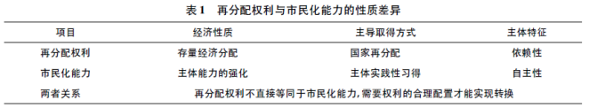 由此,再分配权利与市民化能力就在取得方式、经济性质、主体特征上都呈现出巨大的差异(见表1)。这深刻表明,作为再分配重要手段的土地权利,并不能够通过简单的权利增加发挥作用,它必须通过合理配置,将土地权利真正转化为农民市民化的能力,提高农民的自主性,才能够加快农民的市民化进程、提升中国的城市化质量。