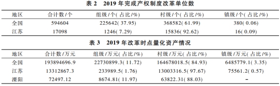 江苏省作为全国首批开展农村集体产权制度改革的试点省份之一,改革起步较早,试点探索经验也相对丰富。目前,江苏省超过99%的村(居)完成改革,共清查核实集体资产超过3000亿元,量化经营性资产1500亿元,确认集体成员超过5000万人,1.7万多家村级股份经济合作社完成登记赋码,整省试点任务基本完成。溧阳市地处江苏省南部,是农村改革的先行区,近年来先后承担了国家城乡融合发展试验、全国乡村治理体系建设试点、江苏省社会主义现代化建设试点等多项改革任务。在农村集体产权制度改革方面,溧阳市聚焦清产核资和经营性资产股份合作制改革两项硬任务,采取一系列有力措施,推动改革不断走向深化。截至2020年9月底,溧阳市188个行政村中完成改革的村有186个,构建村级股份经济合作社185个,合作联社1个。
