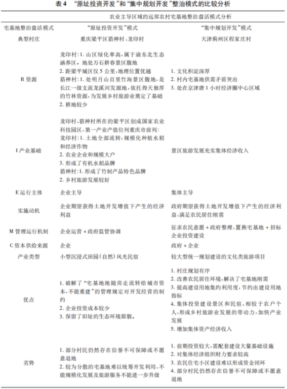 在资源、产业基础方面,“原址投资开发”模式保留了宅基地的原有布局,对于地处远郊山区,闲置宅基地分布较为零散的地区提供了一个学习探索的方向,但是这种模式对资源和产业基础要求较高,旅游资源应当较为丰富,尤其是自然资源;第一产业发展较好,农耕文化进一步带动田园旅游氛围;人地矛盾不突出,农民基本的居住可以得到满足。“集中规划开发”模式则适用于土地利用供需矛盾较为突出的区域,但是对集体能力要求较高,尤其是资金实力,需要有产业基础。