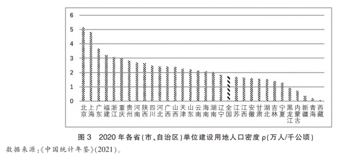 如图3所示,北京、上海、广东、福建、浙江等省市当前单位建设面积人口密度较高,远高于全国平均水平。相较于人口密度较小的省(市、自治区),前述省市建设用地扩张、进而导致耕地资源发生“非农化”转变的驱力更强。