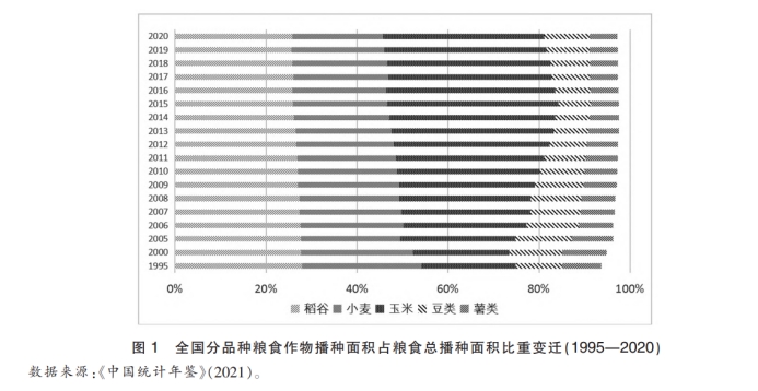 从粮食种植结构变迁来看,我国谷物(含稻谷、小麦、玉米)占粮食播种面积比重最大,达80%以上。其中稻谷占比有小幅降低,但整体稳定在粮食播种总面积的25%~26%;小麦占比降幅明显,由1995年的26.2%降至2020年的20.0%;玉米占比增幅最大,由20.7%提升至35.3%;豆类占比先降后升,2015年仅占粮食播种面积的7.1%;薯类占比缓慢降低,2015年后基本维持在6.1%上下(图1)。同时,我们需注意到,作为主要的饲料粮品种,2020年我国玉米进口量1124万吨,玉米产量26066.5万吨,自给率仅95.87%,仍未实现基本自给,不能仅因其播种面积占比有所提升而丧失对玉米品种的关注。