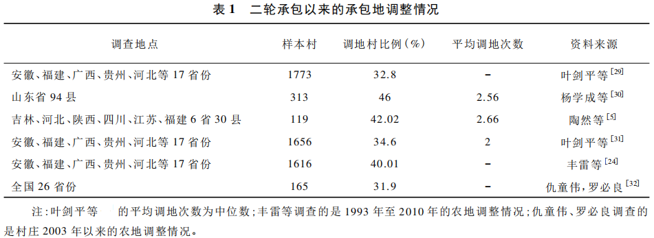 从政策上看,中央不断强化对承包地调整的限制,而承包地调整在部分地区仍有发生。过往调查结果显示(表1),在调地村庄比例上,第二轮承包期内进行过土地调整的村庄占比为30%~50%。同时,有相关分析发现,二轮承包期内的调地村庄比例较一轮承包期有所下降。如从分田到户至1999年,被调查村中调整过土地的占比是79.9%;从二轮承包至2008年,有过土地调整的村庄占比为37.5%,但这依然是一个较高的比例。在平均调地次数上,被调研村庄中有过调地经历的村庄在二轮承包期内的平均调地次数超过2次。这些调整往往以小调整为主,根据丰雷等的调查,二轮承包期内进行土地调整的村庄平均调地约2.4次,其中大调整0.6次,小调整1.8次。