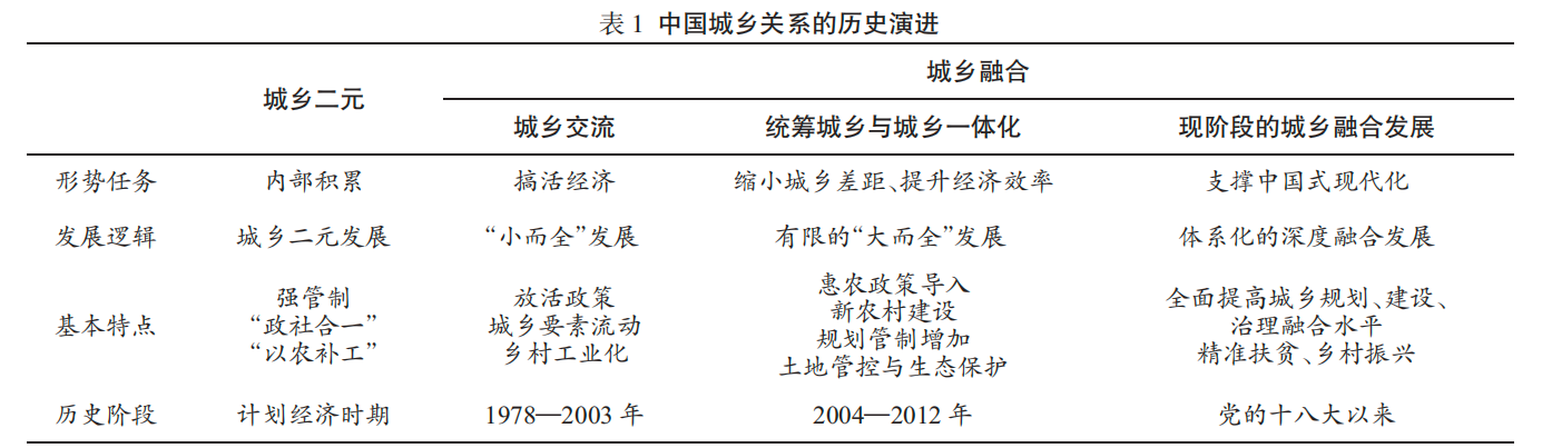 伴随中国进入“以工促农、以城带乡”的新阶段,2004—2012年,国家政策出现新的调整,总的形势任务是缩小城乡差距和提升经济发展效率。一方面,国家出台了一系列惠农政策,如2005年启动了新农村建设工程,特别是2006年全面取消了农业税;另一方面,随着各地工业化、城镇化带来的土地要素消耗和生态环境污染问题不断突显,国家政策基调逐步从“放活”转变为增加规划管制,以节约土地和提升经济发展效率。在这一时期,城乡之间自成体系的“小而全”发展逐步被理解为缺乏效率,也无法解决经济发展中的生态环境保护问题,因此增加经济发展的规划性和整体性成为新的发展导向。在此背景下,国家先后提出了统筹城乡和城乡一体化等新战略,试图从根本上深化城乡融合发展,特别是发挥城市与乡村在经济社会发展进程中的各自优势,扬长避短地形成城乡深度融合的发展局面。2012年,党的十八大召开,中国特色社会主义进入新时代,我国经济实力显著增强,同时外部环境出现重要变化,城乡融合发展是中国现代化建设的必然趋势。现阶段的城乡融合发展延续了提升城乡发展整体性、系统性的要求,特别是要形成一种体系化的深度融合的发展格局,体现为发挥城乡各自优势,城乡产业错位协同,并形成互成体系的整体发展格局。从实现逻辑上而言,现阶段的城乡融合发展显然需要更加有效的政府作为,所以党和国家提出要统筹新型工业化、新型城镇化和乡村全面振兴以及全面提高城乡规划、建设、治理融合水平。