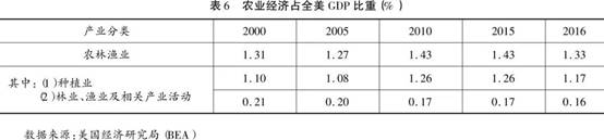 美国乡村涵盖了72%的美国国土面积, 拥有4600万乡村居民, 但乡村人口在城乡占比中有持续下降趋势, 即由1980年的18.08%下降到2016年的14.27%。乡村经济约占美国GDP的5%, 其中农业虽然只占全美GDP的1.3%左右 (见表6) 。