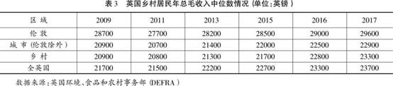 在与城市的互动中, 英国乡村地区抓住自身的禀赋潜力, 积极参与城乡产业价值链分工并扩增乡村居民的收入渠道。英国乡村居民年总毛收入近年来增长稳定, 如2016—2017年乡村居民年总毛收入的中位数超过了英国城市地区 (伦敦除外) (见表3) 。
