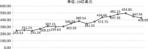 近年来, 美国农业总产值虽然呈现了减少的趋势, 但总体保持了较稳定的发展态势, 美国农林牧渔业GDP由2000年的2435亿美元增长到2016年的4281亿美元 (见图1) 。美国乡村经济开放度高, 是全球农产品出口的主导力量, 美国农产品出口占全球比重长期维持在9%~11%, 2016年农产品出口占全球比重的9.82%。农产品出口额 (按SITC0+1+22+4 (2) 算) , 从2000年的543.41亿美元增长到2016年的1355.79亿美元。