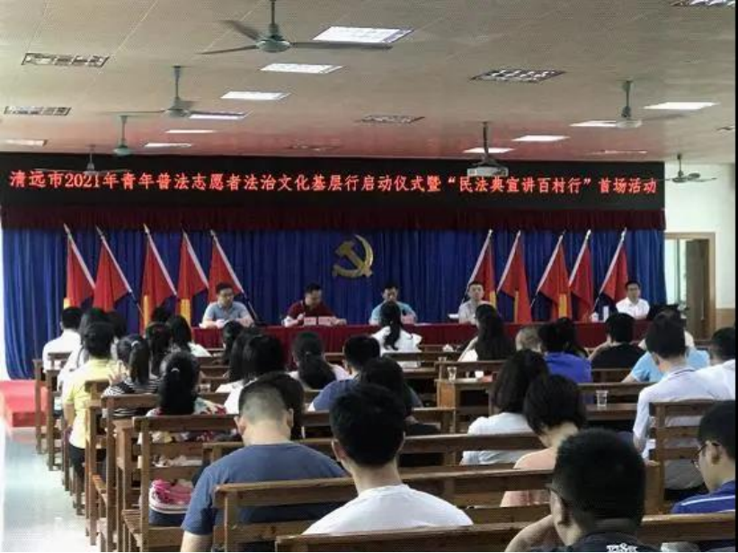 为进一步学习贯彻习近平法治思想,广泛传播法律知识,加强民法典的宣传,培养广大群众法律意识,5月20日,清远市法学会、司法局、团市委联合清城区法学会在洲心街举办了清远市2021年青年普法志愿者法治文化基层行启动仪式暨“民法典宣讲百村行”首场活动,送法下乡,让民法典真正成为家家户户的“社会生活百科全书”。