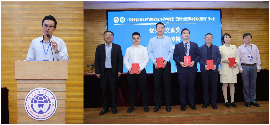 中山大学法学院副教授、广东省法学会民商法学研究会秘书长董淳锷对年会论文情况进行汇报,并主持优秀论文颁奖仪式。周林彬教授和高飞教授向获奖代表颁发获奖证书。