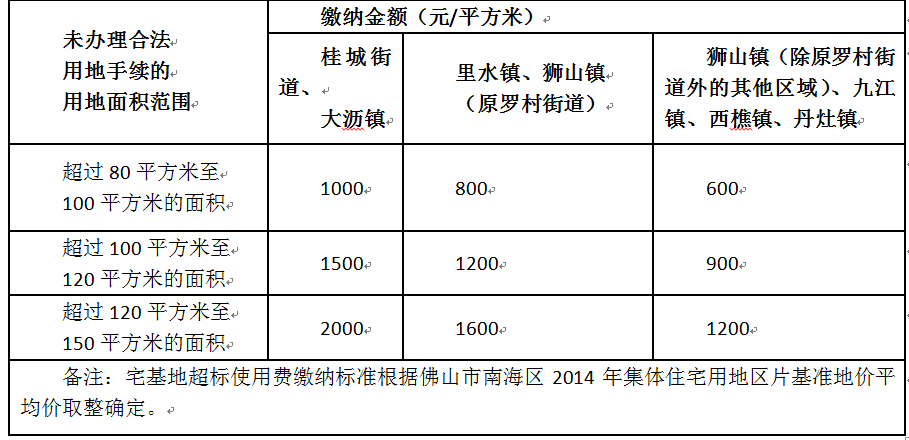 (六)缴费。根据公示无异议证明,由镇街宅改办以佛山市南海区国土城建和水务局的名义出具《行政处罚决定书》和《行政处罚罚款通知书》并发送至对应村(居)委会;涉及宅基地超标使用的,由村(居)委会开具宅基地超标使用费缴纳单。申请人应按要求在规定时限内到指定地点缴纳违建处罚金和宅基地超标使用费。